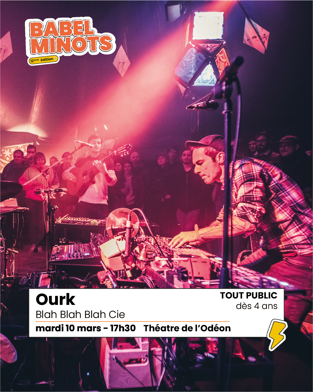 ![]() | Ourk Blah Blah Blah cie Dès 4 ans 10 mars 2026 | Avec ses métissages musicaux, du krautrock à l’électro, du rock’n’roll à la cumbia, ce concert est une invitation aux voyages. Du cocktail (de fruits bien sûr) siroté sur une plage paradisiaque à la moiteur d’une capitale sud-américaine, Ourk embarque petit·es et grand·es le temps d’un concert joyeux et dansant. |